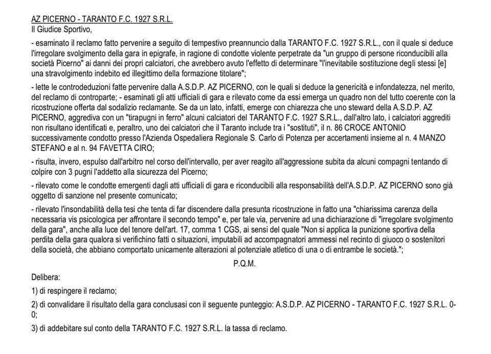– lette le controdeduzioni fatte pervenire dalla A.S.D.P. AZ PICERNO, con le quali si deduce la genericità e infondatezza, nel merito, del reclamo di controparte; – esaminati gli atti ufficiali di gara e rilevato come da essi emerga un quadro non del tutto coerente con la ricostruzione offerta dal sodalizio reclamante. Se da un lato, infatti, emerge con chiarezza che uno steward della A.S.D.P. AZ PICERNO, aggrediva con un “tirapugni in ferro” alcuni calciatori del TARANTO F.C. 1927 S.R.L., dall’altro lato, i calciatori aggrediti non risultano identificati e, peraltro, uno dei calciatori che il Taranto include tra i “sostituti”, il n. 86 CROCE ANTONIO successivamente condotto presso l’Azienda Ospedaliera Regionale S. Carlo di Potenza per accertamenti insieme al n. 4 MANZO STEFANO e al n. 94 FAVETTA CIRO;