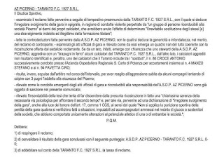 – esaminato il reclamo fatto pervenire a seguito di tempestivo preannuncio dalla TARANTO F.C. 1927 S.R.L., con il quale si deduce l’irregolare svolgimento della gara in epigrafe, in ragione di condotte violente perpetrate da “un gruppo di persone riconducibili alla società Picerno” ai danni dei propri calciatori, che avrebbero avuto l’effetto di determinare “l’inevitabile sostituzione degli stessi [e] una stravolgimento indebito ed illegittimo della formazione titolare”;