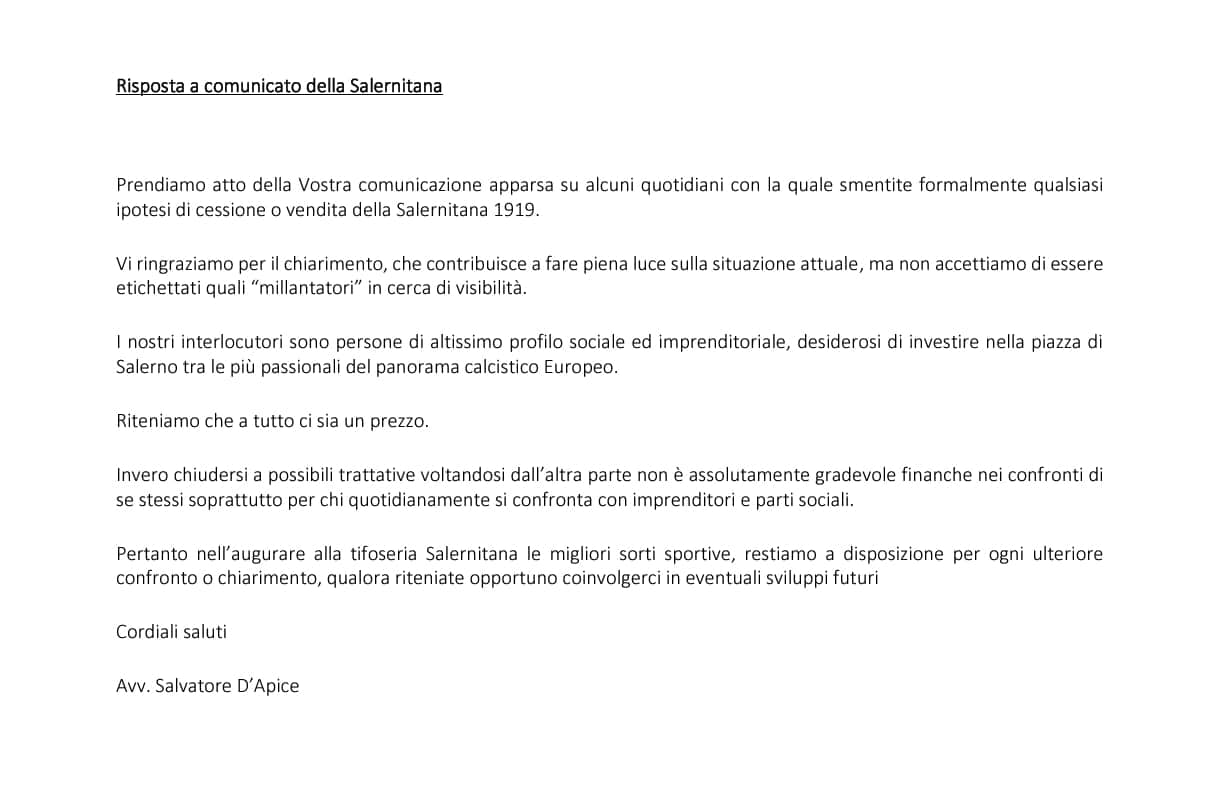 Nel comunicato, l’avvocato D’Apice ringrazia la società per il chiarimento, ma respinge con fermezza l’idea che i potenziali acquirenti siano da considerare dei “millantatori”, rivendicando invece la serietà e il profilo degli interlocutori coinvolti: “Si tratta di persone di altissimo profilo sociale ed imprenditoriale, desiderose di investire nella piazza di