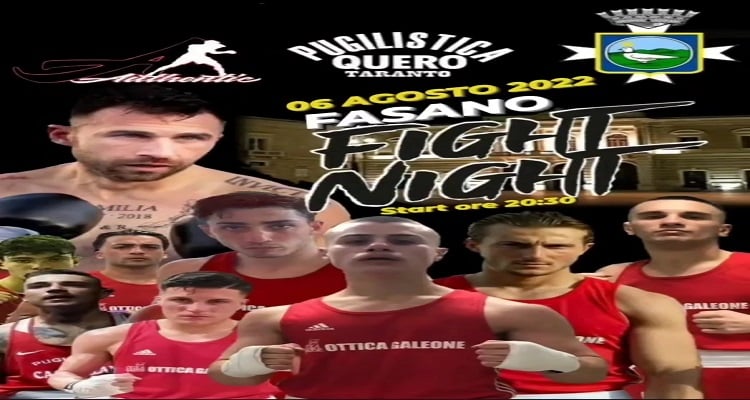 Il clou della notte di boxe fasanese sarà il match professionistico sulle sei riprese del supermedio mottolese Francesco Castellano (6 vittorie, 1 pari e 4 sconfitte) che incontrerà l’ascolano Luca Di Loreto (1 vittoria e 1 sconfitta) del Ruffini Team del maestro Roberto Ruffini. Riflettori accesi poi sul contorno dilettantistico con otto match AOB di boxe maschile e femminile, che vedranno protagonisti i pugili fasanesi, monopolitani e tarantini della Quero-chiloiro: Ivan Gimmi, Giacomo Gioioso, Vito Speciale, Angelo Dragone, Nicola Cesarano, Marco Demitri e Graziana Bruno. Le società avversarie arriveranno da Abruzzo, Calabria e Puglia.