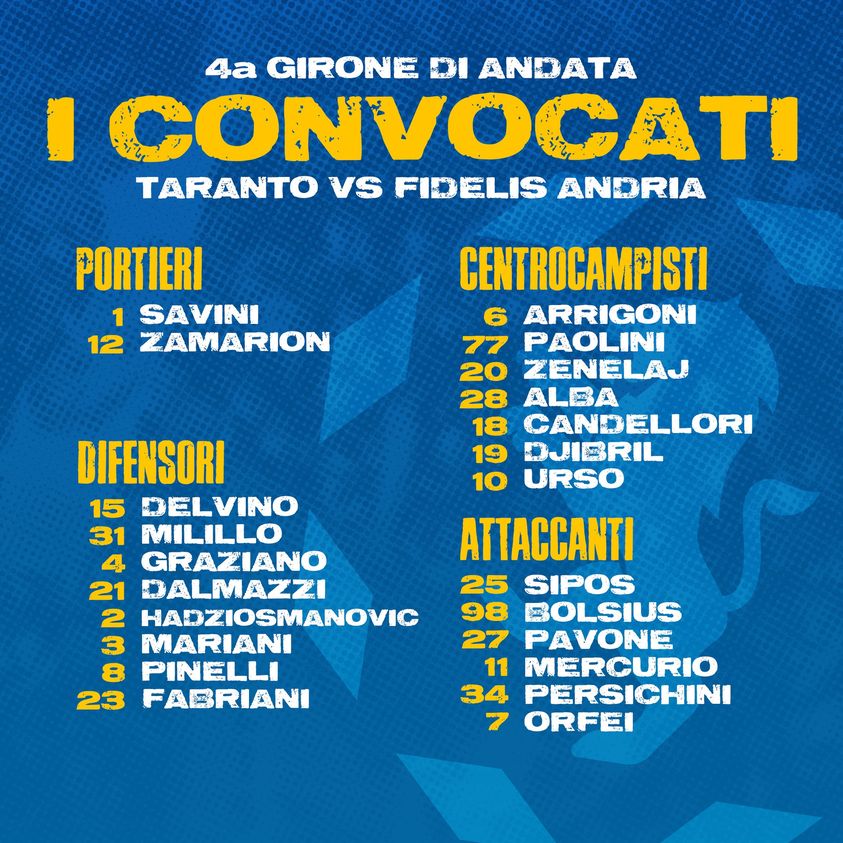 Taranto, i convocati: c'è il neo arrivato Vannucchi