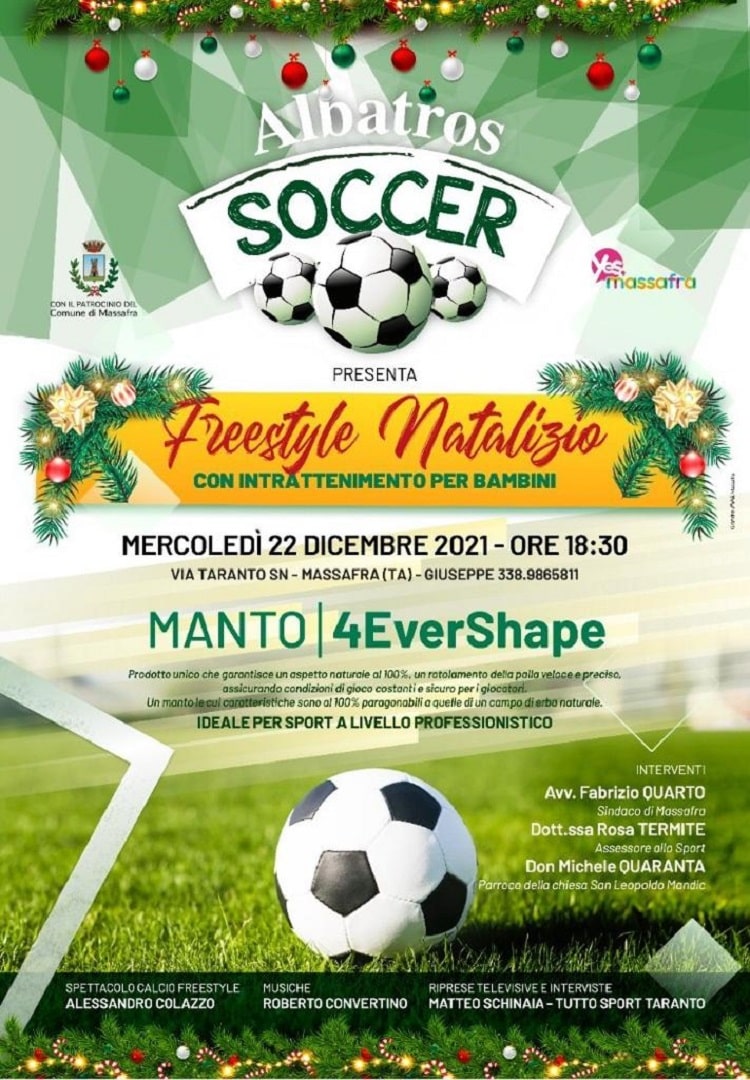 Sport, intrattenimento e innovazione nell’imperdibile evento Freestyle Natalizio, organizzato dall’Albatros Soccer, che si terrà domani, 22 dicembre, dalle 18:30 nel bellissimo impianto di via Taranto a Massafra.