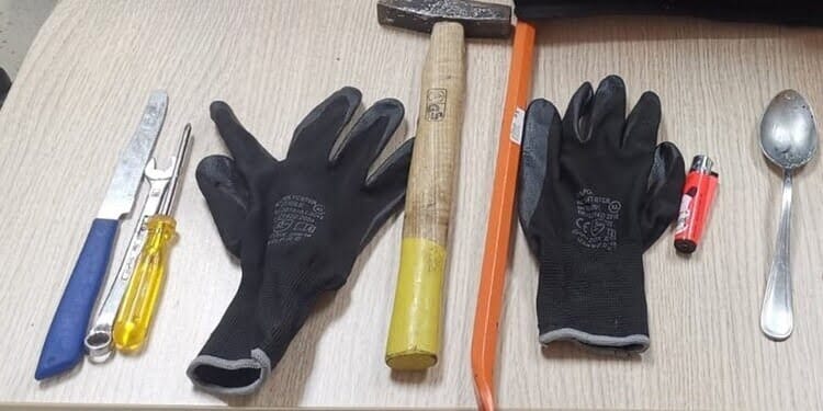 Il controllo personale ha permesso di rinvenire, all’interno di una sacca che portava a tracolla, numerosi arnesi da scasso, tra cui un “piede di porco”, un grosso martello, un cacciavite da 16 centimetri e dei guanti in plastica, oltre a circa 30 euro in monete e banconote, asportati poco prima dal registratore di cassa.