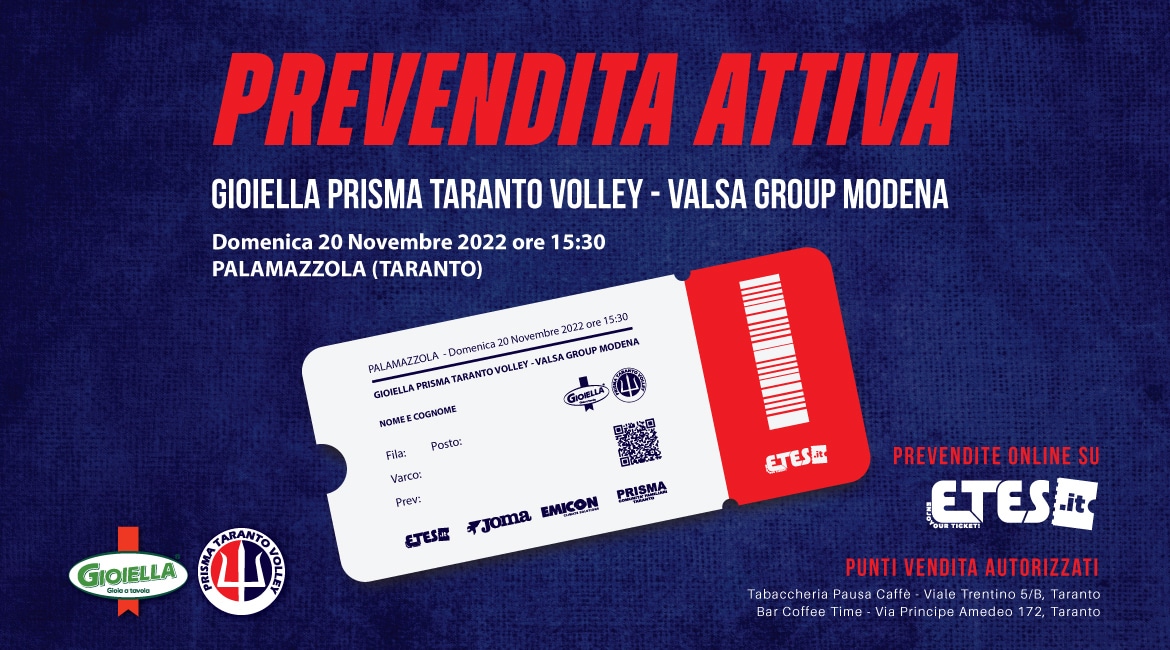 La Gioiella Prisma Taranto Volley comunica che è attiva la prevendita dei tagliandi relativi all’incontro, valevole per l’ottava giornata di Superlega Credem Banca, contro la Valsa Group Modena. L’incontro si terrà domenica 20 novembre alle 15.30 presso il PalaMazzola.