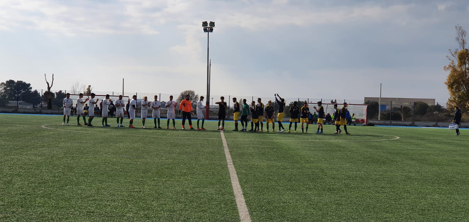 Partita che si apre subito con un occasione al minuto 3 per i padroni di casa con un tiro di Costantino che impegna Darboe con successo per quest’ultimo. All’ 11’ Palagiano che passa in vantaggio con un tirocross di Trawally, che dalla destra mette in mezzo il pallone che prende una traiettoria beffarda per l’estremo difensore stattese e palla che s’insacca in rete per l’1-0 gialloblù. Palagiano che prende campo e prova il raddoppio prima con Calia dal limite che non impensierisce il portiere, e poi con Maggi che di testa sfiora il palo raccogliendo un perfetto cross di Calia. Al 35’ Trawally va in solitaria saltando un avversario e sparando un destro che viene respinto dal portiere; al 40’ Santovito Mario entra scomposto in mezzo al campo su Tanzarella e viene giustamente espulso dal direttore di gara lasciando in inferiorità numerica i suoi e costringendo Tanzarella a lasciare il terreno di gioco a favore di Camara che appena prima dell’intervallo non arriva di un niente su un tiro potente rasoterra di Calia che va a fin di palo. Inferiorità numerica che però non scoraggia lo Statte che da il primo squillo sull’ultima palla della prima frazione con un bel calcio di punizione di Marangione che chiama in causa Darboe pronto a respingere.