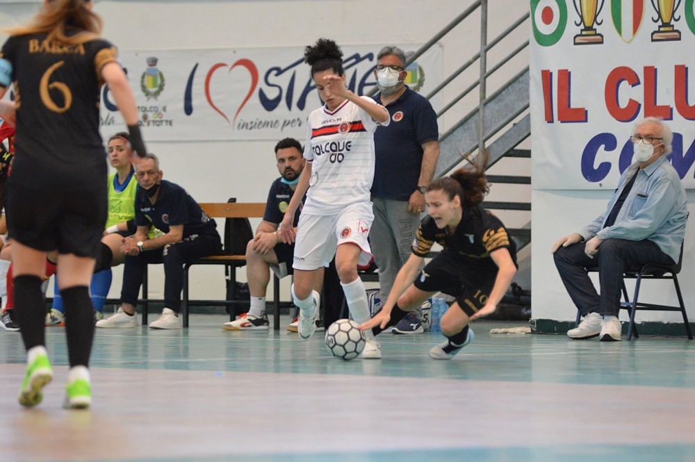 Una splendida Italcave Real Statte vince tecnicamente, tatticamente e fisicamente contro la Lazio per 4-3 chiudendo a proprio favore la serie dei quarti di finale. Perfetti sia il primo tempo che la ripresa delle Rossoblu che hanno dimostrato di essere una grande squadra matura, in grado di subire il minimo con il portiere di movimento avversario inserito per tutti e 20 i minuti effettivi finali. Per le ioniche adesso in programma la semifinale con il Falconara: gara 1 sabato in terra abbruzzese, gara 2 mercoledì 26 al Palacurtivecchi, eventuale terza gara in casa del Falconara. Italcave che parte con Margarito, Soldevilla, Renata, Valeria e Mansueto. Risponde la Lazio con Tirelli, Taninha, Siclari, Barca e Vanessa. Al 1′ 22″ cross di Soldevilla, mani netto di Siclari e calcio di rigore a favore delle rossoblù: sul dischetto si porta Ana Soldevilla contro Tirelli ed è goal per l’Italcave. Quasi al settimo minuto di gioco Renata conclude di poco alto sulla traversa e guadagna un calcio d’angolo vista la miracolosa deviazione di Tirelli. Al 8′ 22″ grande azione di Renata dopo un recupero difensivo, cross basso per Soldevilla ed e’ 2-0. Minuto 13 20″ ancora gol di Soldevilla, tiro da esterno, deviazione di Tirelli, ma nulla da fare: è 3-0 per lo Statte. Per la numero 8 stattese è la prima tripletta della carriera. Poco dopo occasione sprecata per il quarto gol: Violi, dalla sinistra, calcia forte in diagonale, Tirelli devia in bagher. Sul finale di frazione grande deviazione su tiro di Vanessa di controbalzo di Margarito in corner. Ripresa e ingresso del portiere di movimento Siclari per la Lazio con l’obiettivo di rimettere in pari il risultato. Ma le ioniche su recupero difensivo riescono a innescare Mansueto, tocca di testa ed è 4-0. Dopo 4 minuti, il portiere di movimento Siclari trova Vanessa tutta sola sul secondo palo e realizza il 4-1. Lo Statte prova a tirare dalla propria metà campo più volte, con Renata, Soldevilla, Violi e Margarito. A 5’45” dalla fine Siclari sul secondo palo realizza il 4-2. Al 18′ 30″, con l’aiuto di Siclari, Taninha insacca il terzo gol per la Lazio. La partita però si conclude con 4-3 ed è gioia in casa Real. Queste le dichiarazioni del tecnico Marzella a fine gara: “Serviva una prestazione da squadra e così è stato. L’Italcave ha giocato un grandissimo primo tempo dove ha sfruttato al meglio le palle a propria disposizione giocando una partita tatticamente precisa e ripartendo nel migliore dei modi. Nella ripresa ci aspettavamo effettivamente il ritorno della Lazio. Era possibile realizzare altri gol con i tanti recuperi difensivi, ma è mancata la precisione. Al tempo stesso c’è stato il grande desiderio di portare a casa il risultato e lo abbiamo fatto con grande tenacia. Abbiamo vinto nonostante l’importante assenza di Boutimah e con alcune ragazze non al meglio della condizione. Bravissime le ragazze a lottare e a crederci su ogni palla, un successo che ha portato ad un meritato passaggio del turno.”