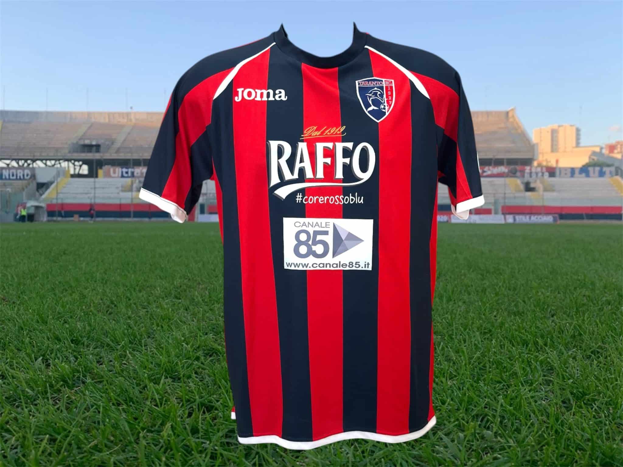La maglia casalinga del Taranto, prodotta da Joma, si presenta con le tradizionali strisce rossoblù. Dal punto di vista tecnico, riflette gli standard delle forniture professionistiche: