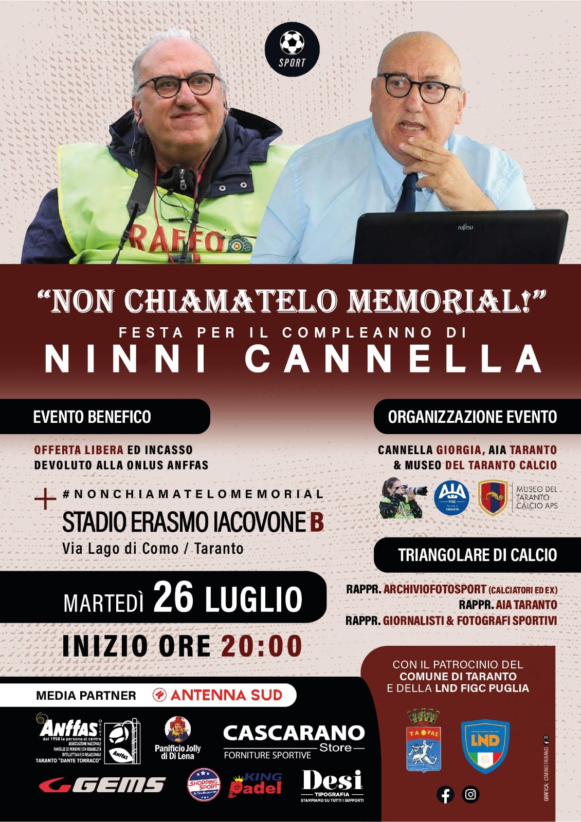 Gli aggiornamenti sull’organizzazione dell’evento, sui partecipanti, saranno disponibili sulla pagina Facebook “non chiamatelo memorial – festa di compleanno per Ninni Cannella”. Si ringraziano gli sponsor dell’evento: Anffas, Panificio Jolly, Gems, Cascarano Store, Tipografia Desi, Shopping Sport. Col patrocinio del Comune di Taranto e della LND-FIGC Puglia. Media partner: Antenna Sud.