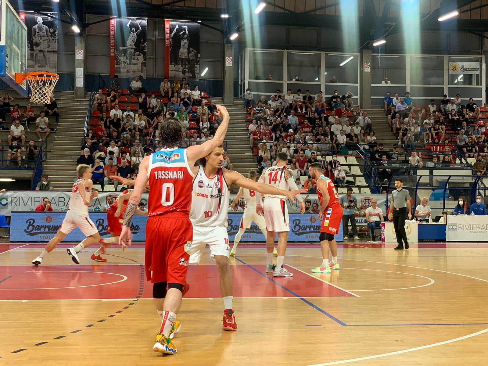 Ponziani fa subito la voce grossa sotto le plance, Rimini invece non perde il filo del discorso con le triple rispetto alla prima partita con un Saccaggi che piazza 5 punti in fila. Capitan Diomede non è da meno dal perimetro e pareggia a 5. Buono anche l’impatto di Gambarota, segna così come Masciadri in caduta per il 7-7. Si continua in equilibrio, Bedetti risponde a Conti, Conti risponde a Bedetti, cambia l’ordine dei canestri ma non la sostanza del punteggio, 12-12 al 5’. Rimini continua ad attaccare il canestro, Taranto invece dà i primi segni di cedimento: Fabiani e Arrigoni costruiscono il primo mini break della partita, 5-0 allargato a +9 dalla tripla di Saccaggi che costringe coach Olive al timeout. Che però non ferma l’inerzia del momento con Arrigoni che chiude l’11-0 di parziale. La reazione rossoblu però arriva nel finale di quarto con la tripla di Conte e il canestro di Conti che alleviano il gap col punteggio che dice 25-17 RBR.