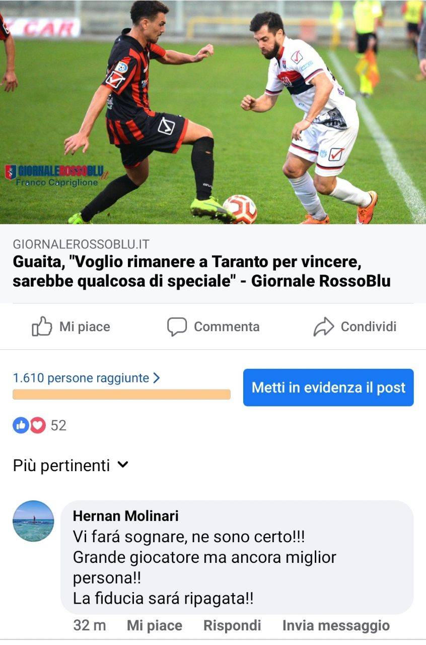 Gradito commento nella pagina Facebook di GiornaleRossoBlu.it sotto il post relativo alla nostra intervista al calciatore del Taranto Leo Guaita, effettuata dal collega Cosimo Lenti. L’ex attaccante rossoblu Hernan Molinari, cugino del giocatore rossoblu, ha scritto bellissime parole per elogiare il proprio familiare:
