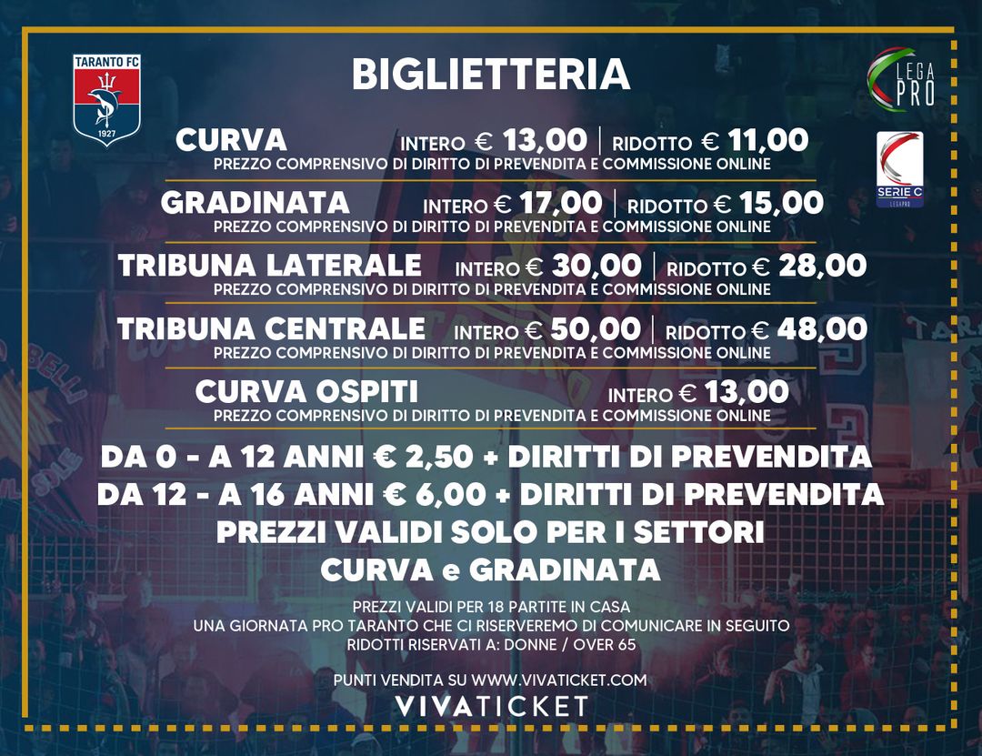 Si comunica che da questa sera ore 19.00 sarà aperta la vendita libera dei tagliandi per assistere al match in programma Domenica 19/12/2021 contro il Picerno, valevole per la 19^giornata di Campionato Lega Pro, presso lo Stadio Erasmo Iacovone alle ore 14.30. Si comunica inoltre, che la vendita resterà aperta sino alle ore 14.30 di Domenica ( orario di inizio gara).