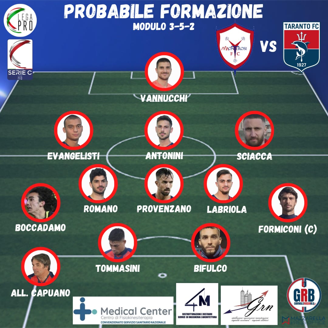 A centrocampo Provenzano dovrebbe agire da play e sarà affiancato da Antonio Romano e uno tra Labriola e Mazza, con il primo leggermente favorito.