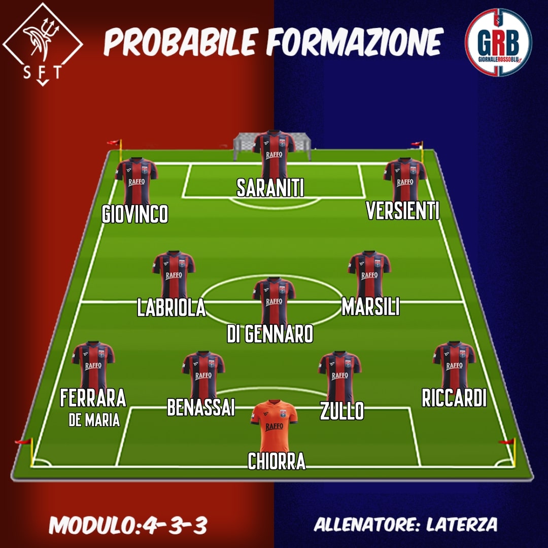 A difendere i pali dei rossoblù ci sarà ovviamente Chiorra. La difesa dovrebbe essere composta da Riccardi, Zullo, Benassai e uno tra Ferrara e De Maria.