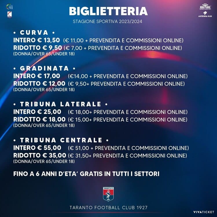 Di seguito il tariffario degli abbonamenti oltre che il tariffario dei prezzi per i tagliandi singoli valevoli per la stagione 2023/24.