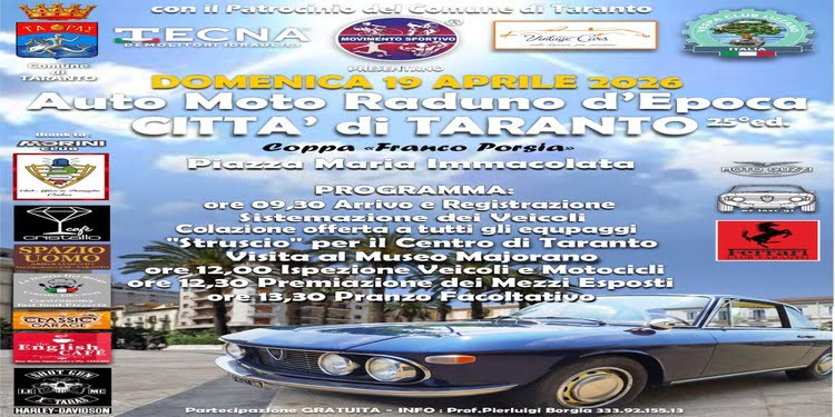 Domenica 19 aprile le strade di Taranto torneranno a essere il palcoscenico della storia del motorismo. Il Ferrari Club Taranto e il Movimento Sportivo, con il patrocinio del Comune di Taranto, presentano la 25ª edizione dell’“Auto Moto Raduno d’Epoca Città di Taranto”, un appuntamento ormai consolidato che trasformerà il cuore del borgo umbertino in un vero e proprio museo a cielo aperto.