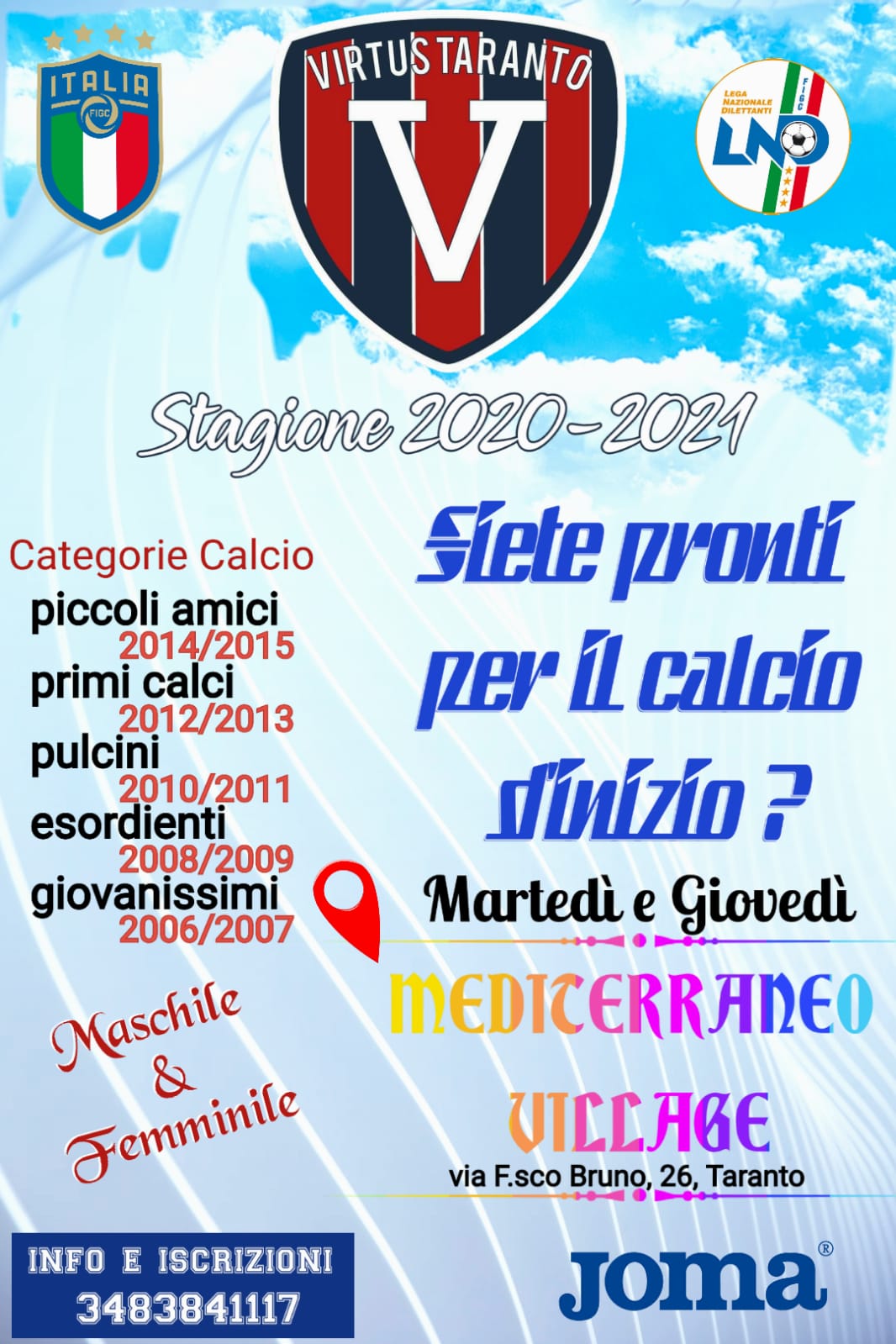 Lunedì 31 Agosto la scuola calcio della Virtus Taranto darà il via alle proprie attività con le prove gratuite dei calciatori e le iscrizioni per tutte le fasce d’età.